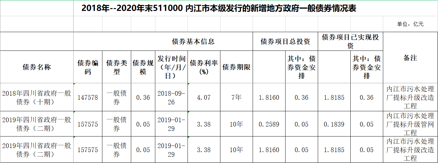 2018年-2020年末511000內江市本級發行的新增地方政府一般債券情況表
