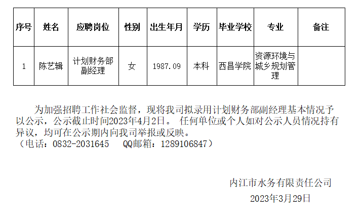 內(nèi)江市水務(wù)有限責(zé)任公司擬錄用計(jì)劃財(cái)務(wù)部副經(jīng)理公示