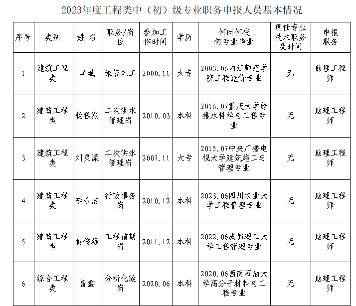 經審核,魯亞梅同志符合申報高級政工師任職資格;吳柏霖、張茜、李昊謙3名同志符合申報工程師任職資格;李斌、楊程翔、劉靈漾、李永潔、黃俊雄、曾鑫、郭炯宏7名同志符合申報助理工程師任職資格;倪勇、張雙馳2名同志符合申報助理政工師任職資格。現對其申報基本情況予以公示。公示期限自9月18日至9月22日。如有異議,請在公示期限內通過書面或其他形式向公司人力資源部反映。