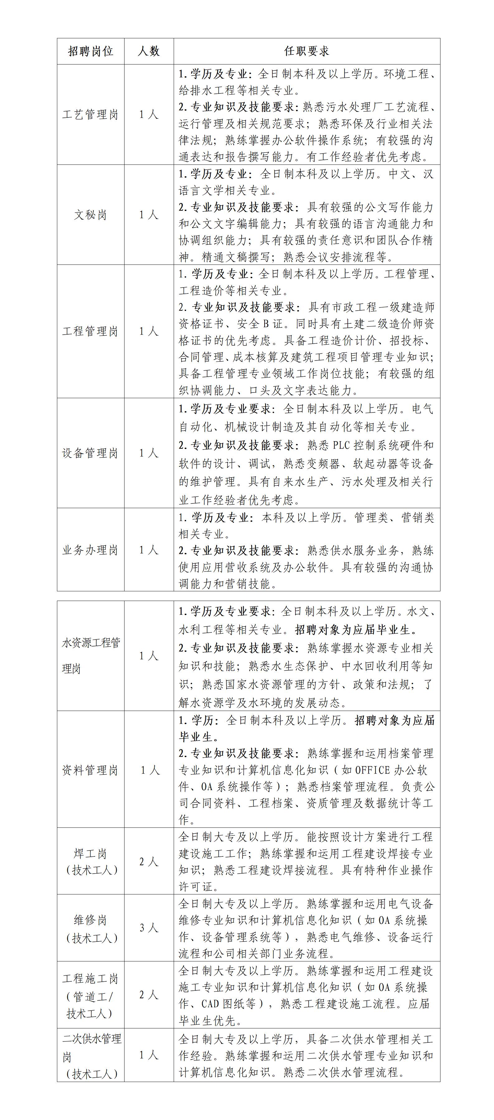 內(nèi)江市水務有限責任公司系內(nèi)江市國資委所屬內(nèi)江投資控股集團有限公司的全資子公司。是集城市供水、污水處理、供排水工程設(shè)計、工程施工為一體的國有獨資市政公用骨干企業(yè)。為滿足公司高質(zhì)量發(fā)展對人才的需求,特面向社會公開招聘相關(guān)人員。現(xiàn)將招聘事項公告如下。