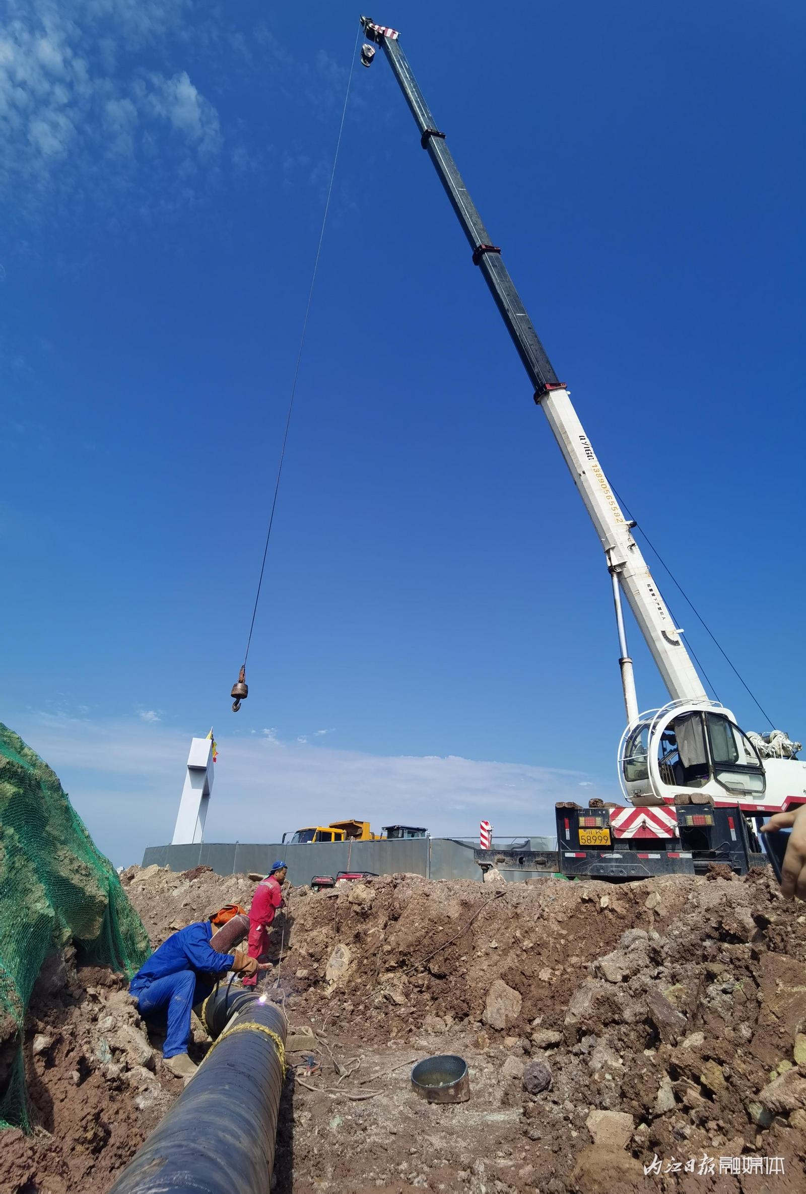 現(xiàn)場(chǎng),機(jī)械聲轟鳴,大型挖掘機(jī)正在馬路邊開溝挖槽,大型吊車將管道吊到挖好的溝槽內(nèi),由施工人員逐節(jié)進(jìn)行焊接……分工明確,專業(yè)有序,白晃晃的陽(yáng)光下,工人們揮汗如雨,衣服早已濕透。